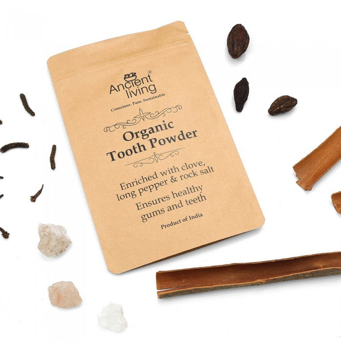 Ancient Living Organic tooth powder which is derived from the heart of Ayurveda is a boon to your oral health care. The carefully selected ingredients deliver a fresh breath and improve your gum health with every use.t has natural teeth whitening products such as clove, long pepper, babool bark, and cinnamon which are historically known to freshen the breath.