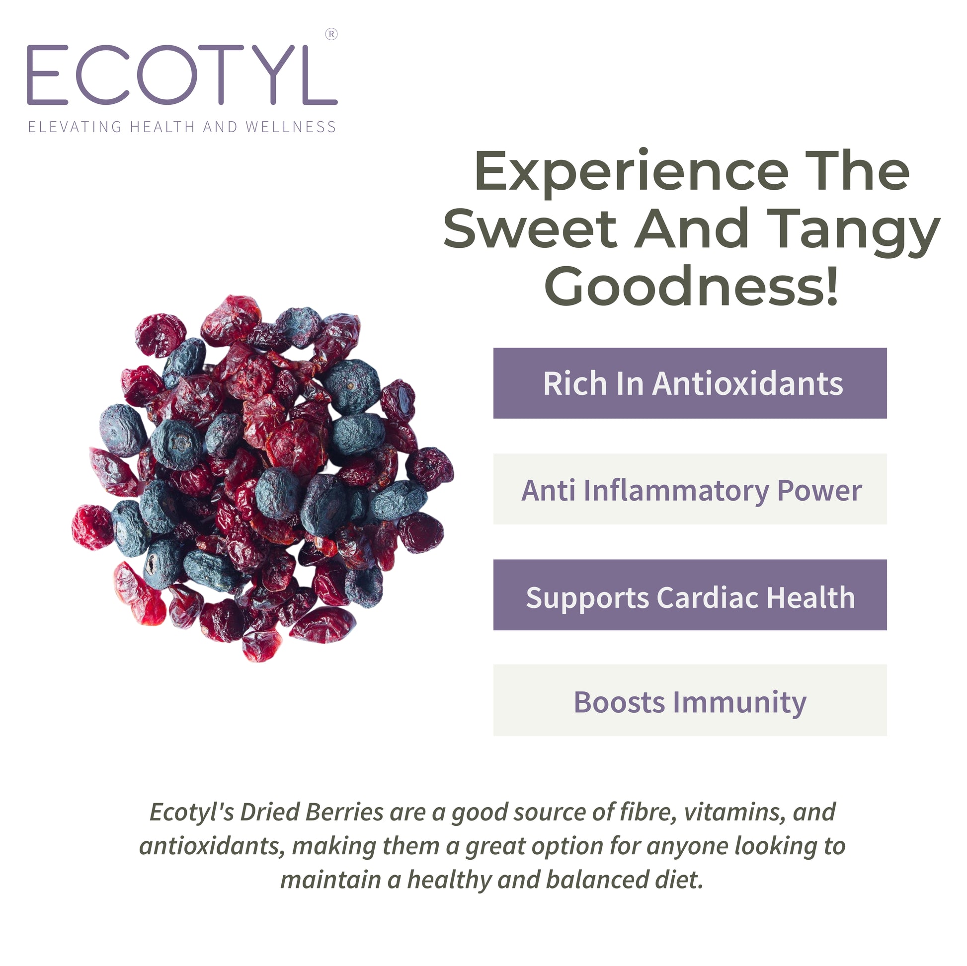 Indulge in the natural goodness of Ecotyl's Dried Blueberries and Cranberries Combo. Bursting with vibrant flavors, these sun-kissed berries are carefully dried to preserve their juiciness. Packed with antioxidants and sweet-tart delight, our blend is a wholesome snack or a versatile ingredient for your favorite recipes. Elevate your taste experience with this irresistible combination, perfect for those who savor the pure essence of nature in every bite.