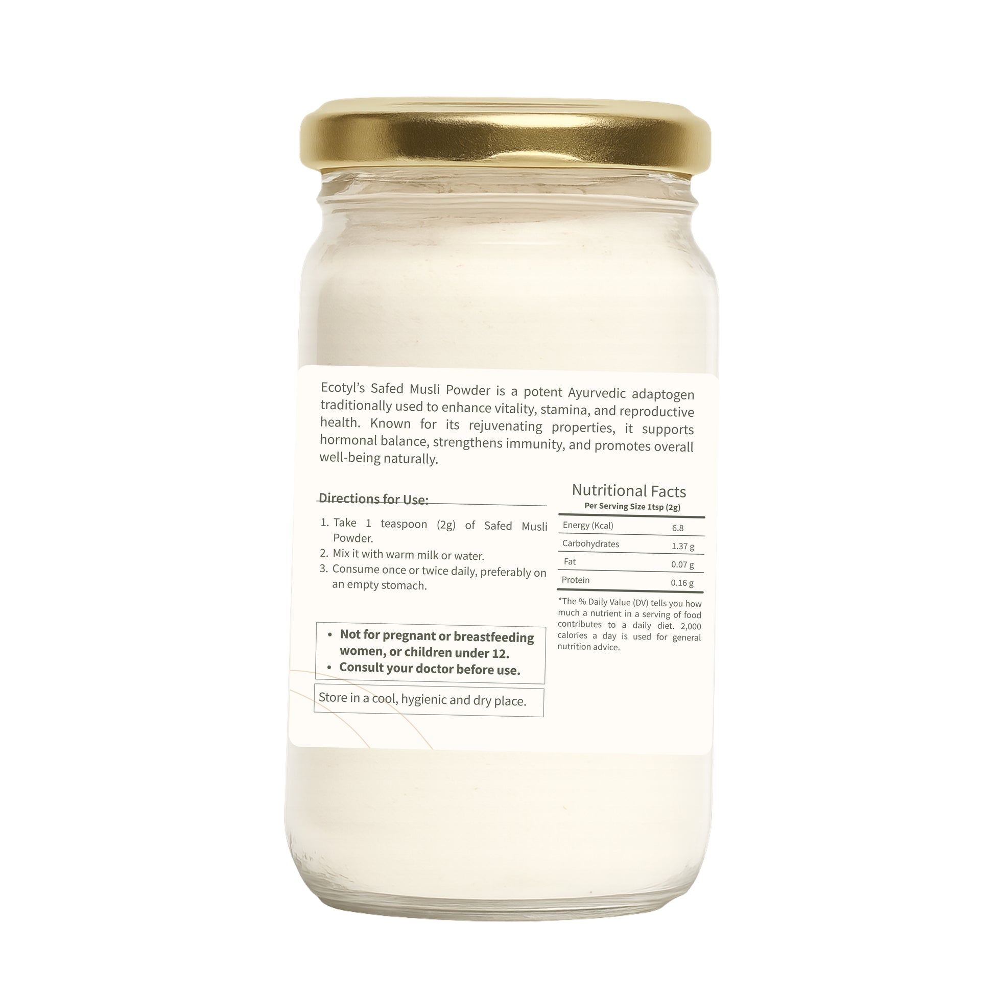 Ecotyl’s Safed Musli Powder is a time-tested Ayurvedic tonic made from the sun-dried roots of the Chlorophytum borivilianum plant, commonly known as Safed Musli. Known for its rejuvenating properties, this natural supplement helps enhance stamina, energy, and hormonal balance, making it a powerful addition to your daily wellness routine. Traditionally used to support strength and endurance, Safed Musli is also recognized for its role in improving reproductive health and reducing fatigue. Whether you're looking to support active living or boost overall vitality, Ecotyl’s pure and potent formulation offers a reliable, plant-based solution.