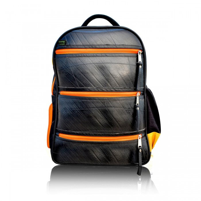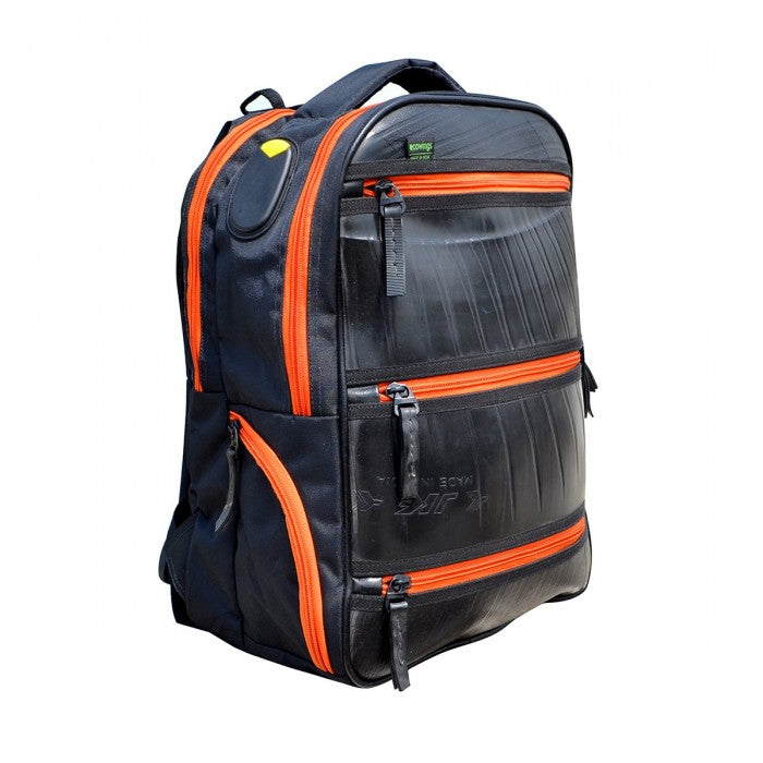 This smart vegan leather, Eco friendly exclusive Back Pack is perfect to carry a lot of stuff along, This black colored backpack will be Your best companion. The practical design allows you to carry your belongings systematically.Made From upcycled vegan leather And Waterproof Canvas, Light in weight, Extremely durable and A worthy pick. This unisex backpack features multiple compartments on front, cushion padding For Laptop and Side Mesh Pockets.