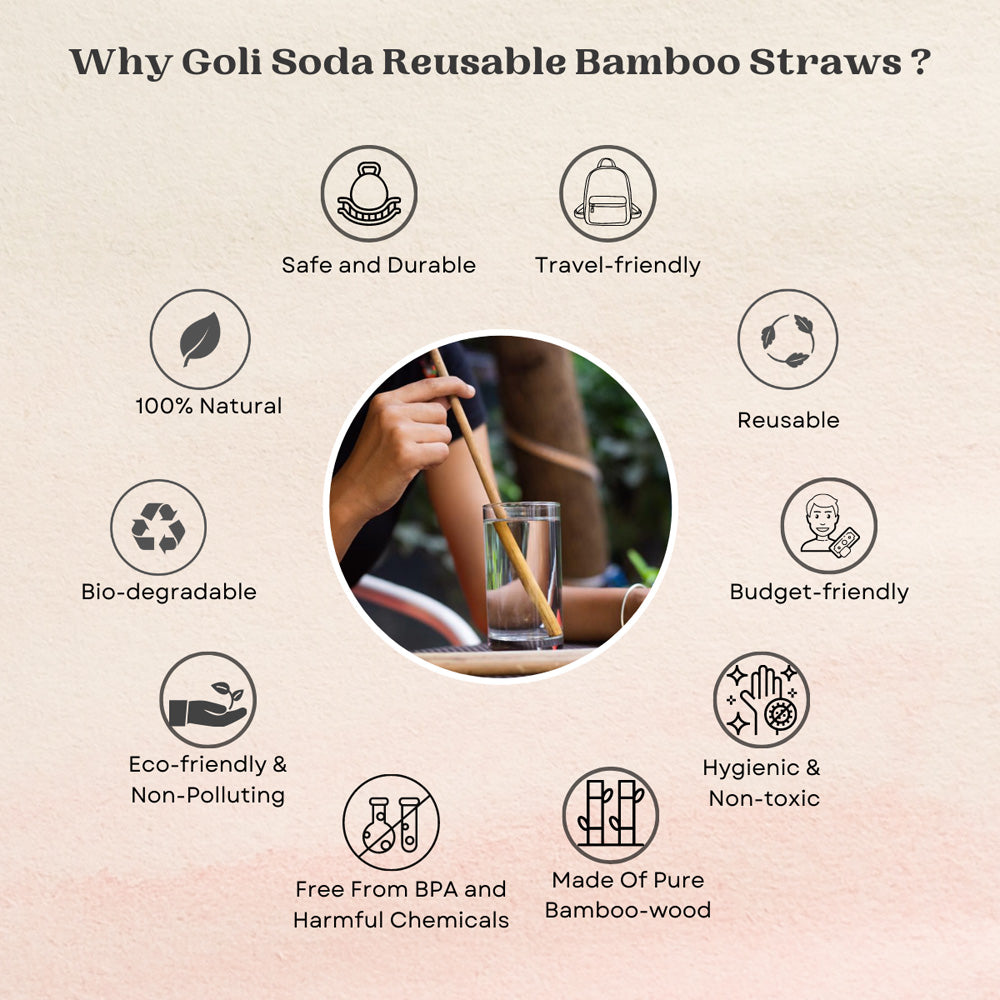 That’s Why Goli Soda Brings To You The Reusable Bamboo Straws That Are Purely Natural And Biodegradable. Bamboo Is Naturally Antifungal Hence Safe To Use. Our Bamboo Straws Offer An Eco-Friendly Yet Economic Alternative To The Widespread Use Of Plastic Straws And Simultaneously Helps Maintain Hygiene. The Straws Can Be Used For Months By Washing Them Before And After Use. They Are Sterilizable In Warm Water.