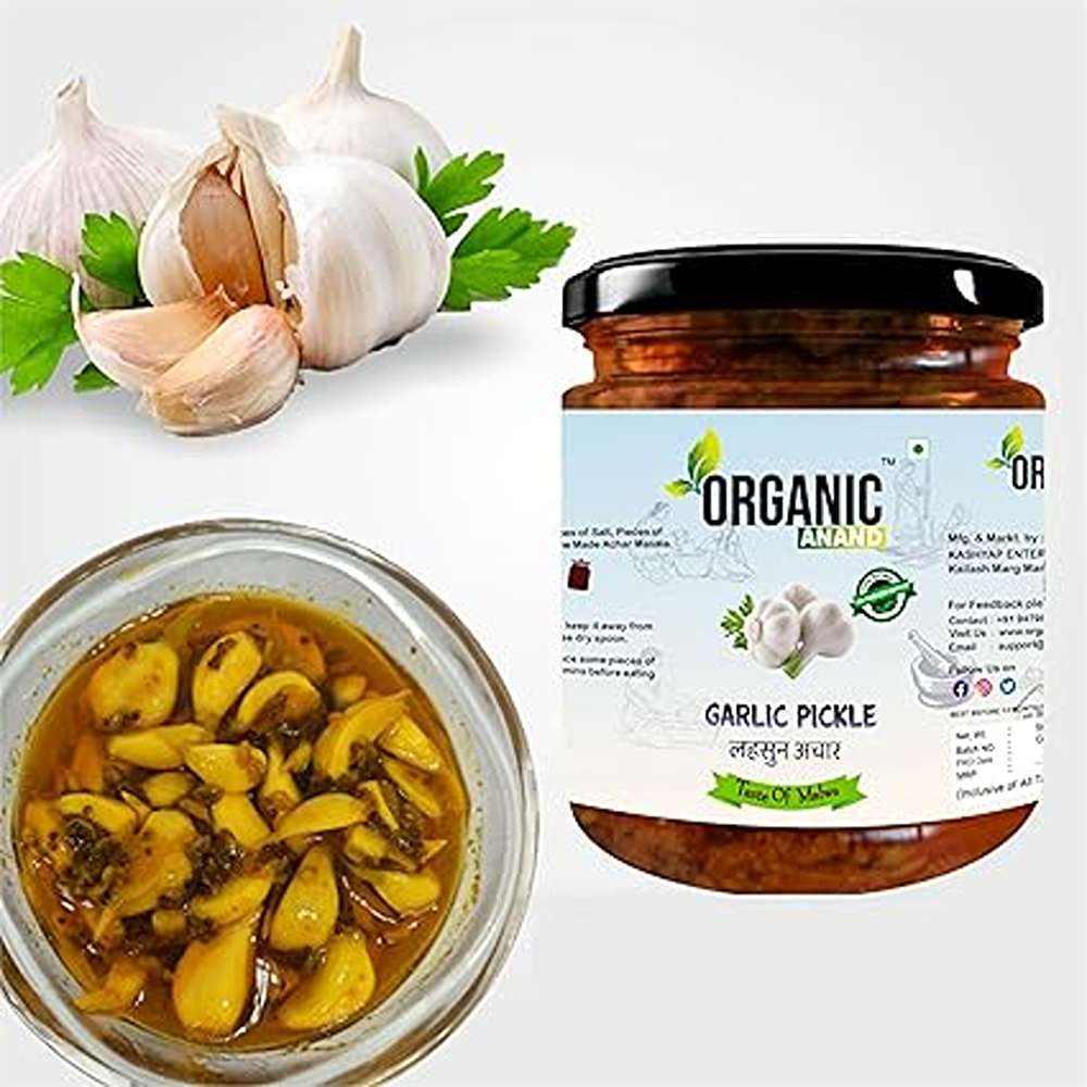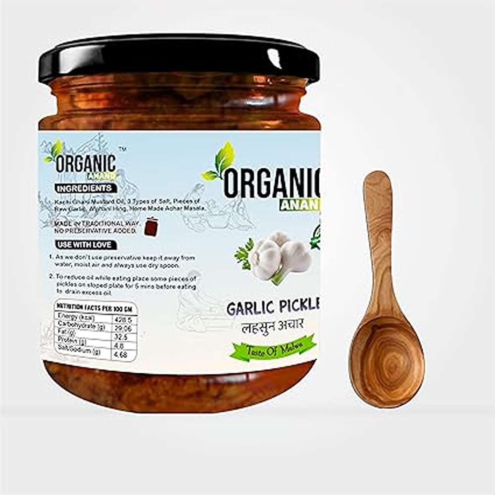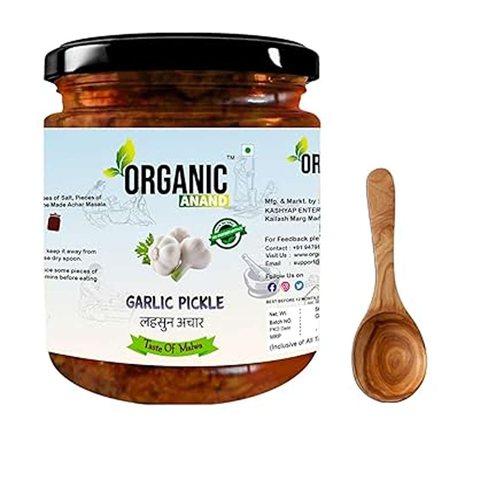 Organic Anand Homemade Garlic Pickle 500gm Lahsoon/Lassan/Lahsun Ka Achaar with Neemwood Spoon, Flavourful, Delicious, Traditional Taste (Pack of 1)