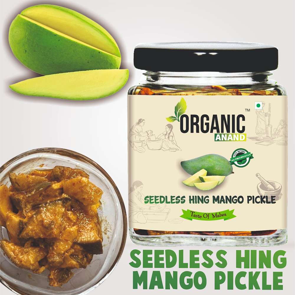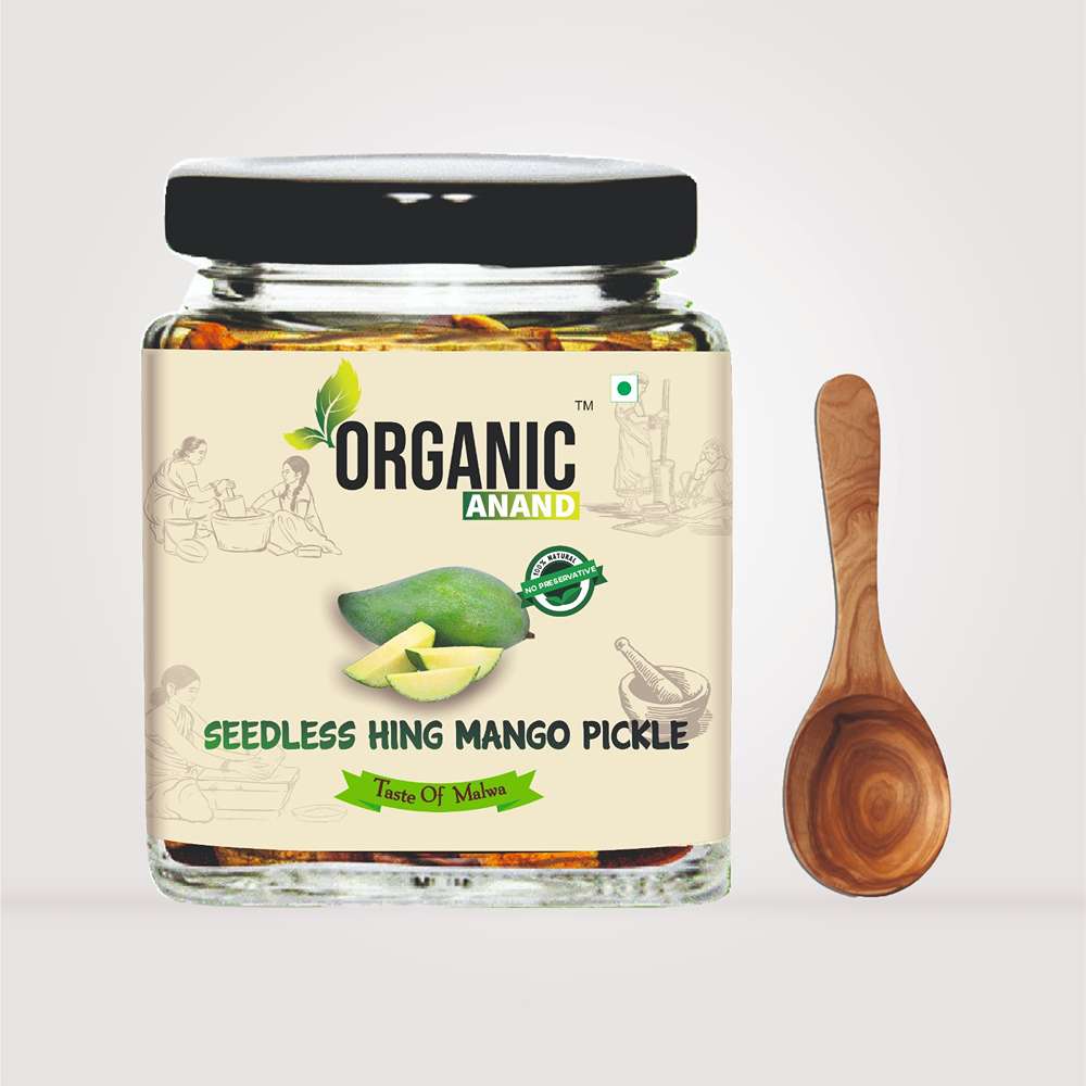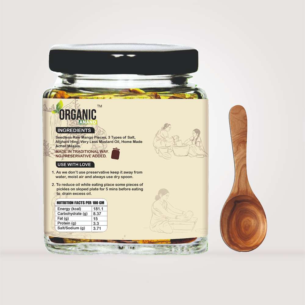 Organic Anand Homemade Seedless Hing Mango Pickles 250gram Oil-Free Traditional Khatta Aam ka Achar with Neemwood Spoon No Preservative