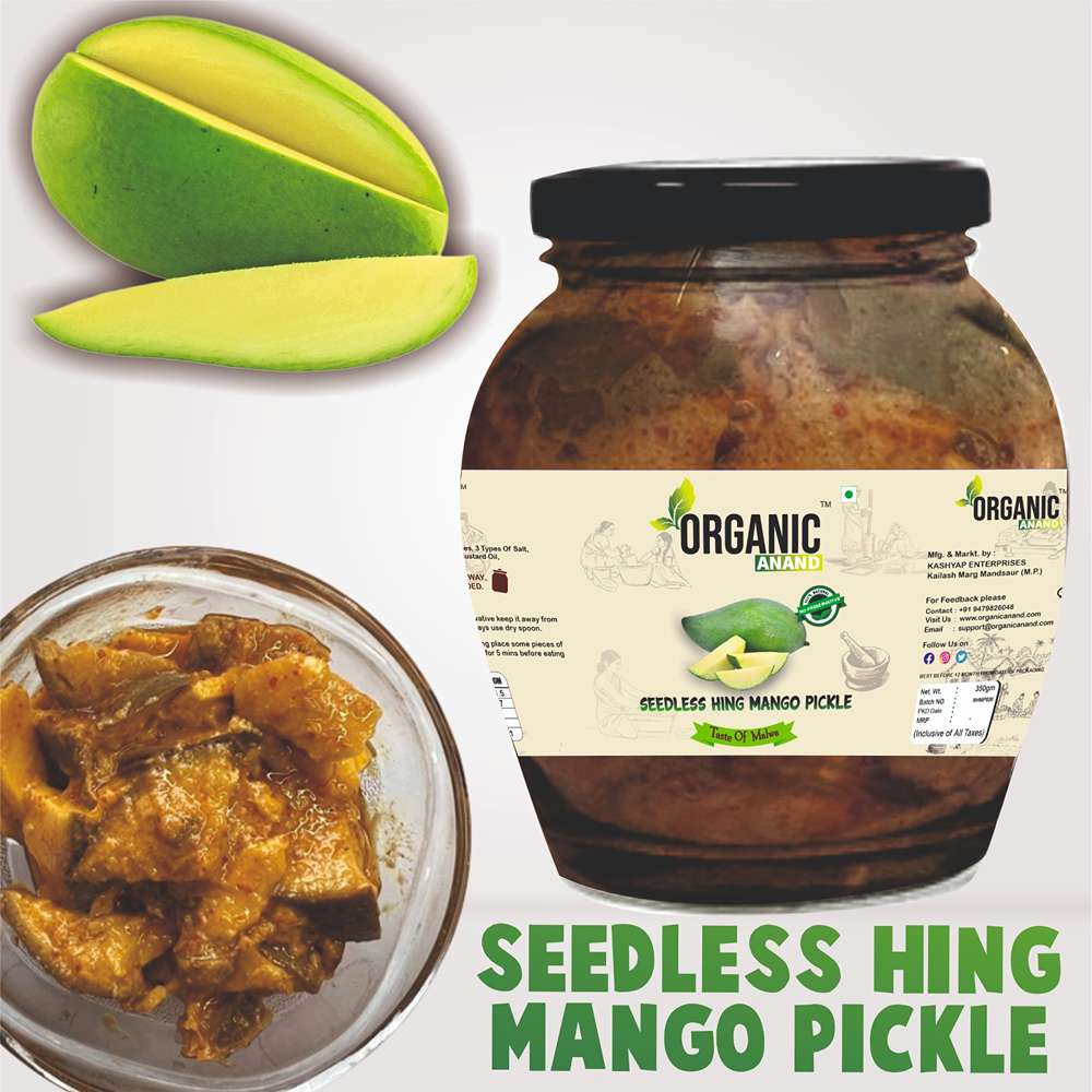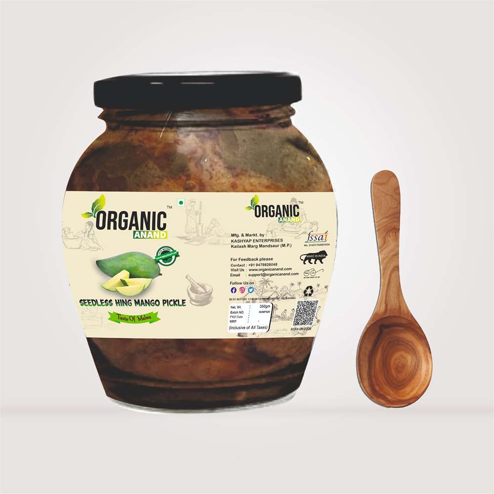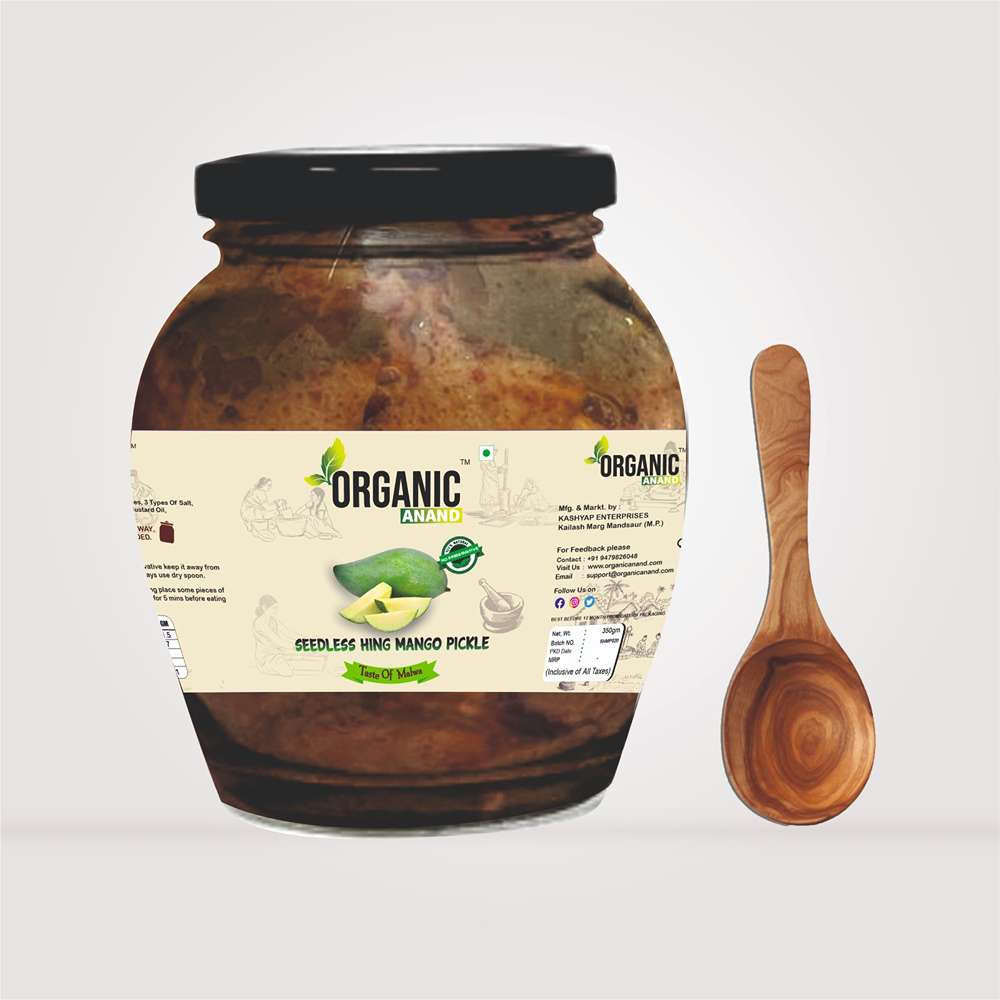 Organic Anand Homemade Seedless Hing Mango Pickles 350gram Oil-Free Traditional Khatta Aam ka Achar with Neemwood Spoon No Preservative