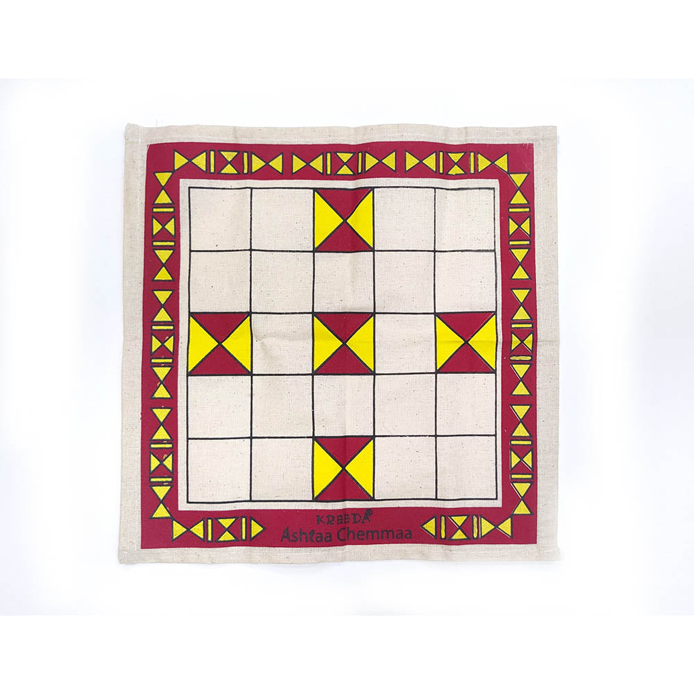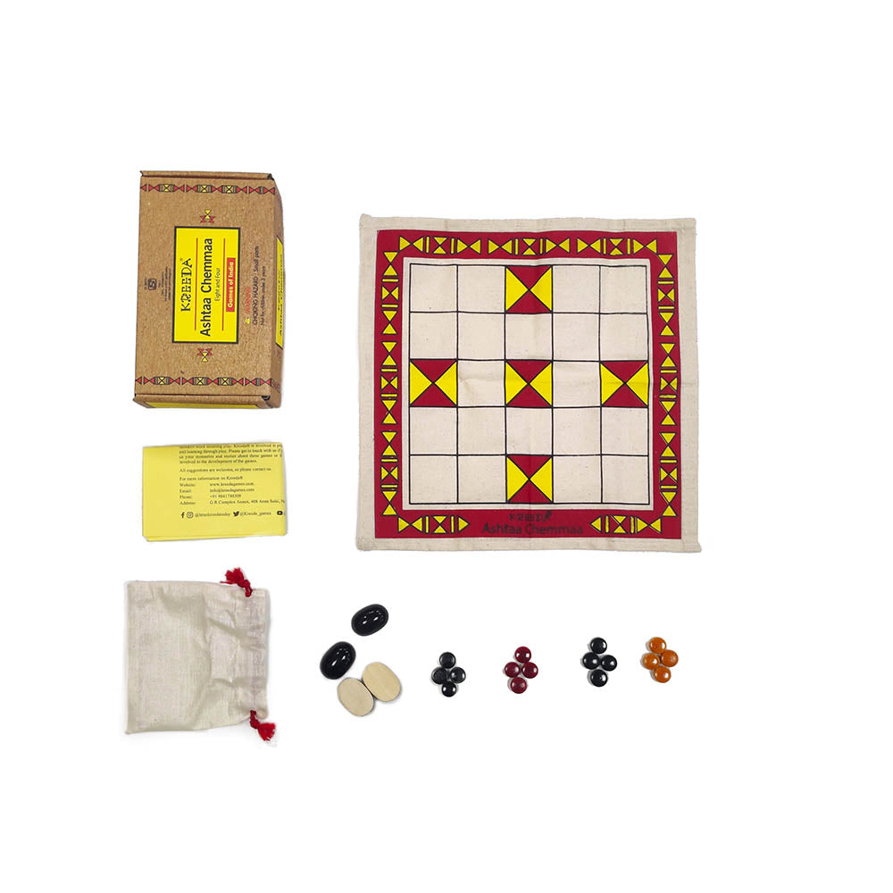“Eight or Four” Four players can participate in this game. The purpose is to take your game pieces from the starting point to the safety of home. The game is traditionally played with cowrie shells instead of dice. To protect our biodiversity, we have discontinued the use of cowrie shells and instead use shell-shaped throw pieces made from wood by artisans from Channapatna.