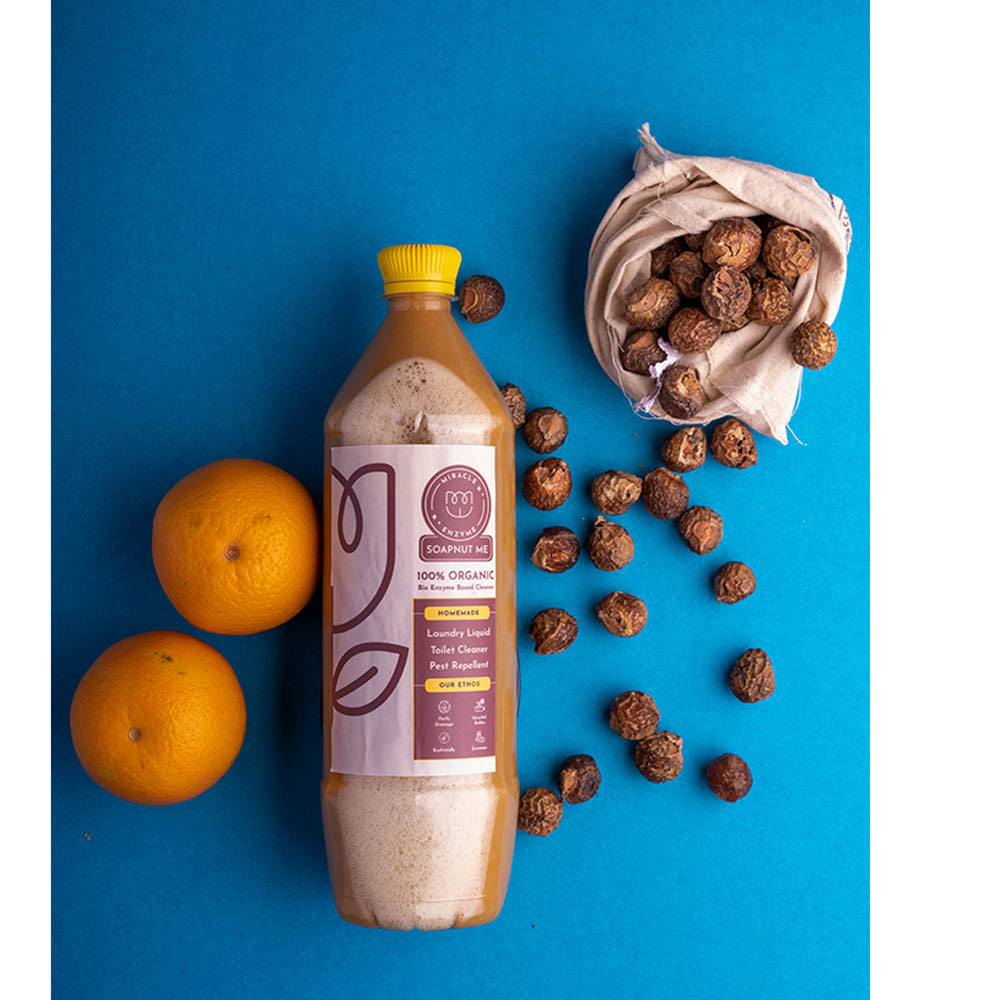 Miracle Enzyme is an entirely natural, organic and chemical-free multipurpose cleaner for your home that not only does its job but also as a by-product ends up cleaning the environment once it goes down the drain. The microbes in bio-enzymatic cleaners are able to reach very small cracks and crevices on surfaces, which means they can eliminate soiling and malodours that traditional chemicals often cannot. It's concentrated and needs to be diluted before use. Lab tested, shows 95% efficiency in killing germs. To sanitize our atmosphere with chemical cleaners, we are potentially destroying the non-pathogenic microbes too from the environment. Moreover, these chemical-based cleaners when sent out to our environment from houses as greywater, pollute the water bodies, and air and also make the soil infertile. For instance, laundry detergents contain phosphate and non-biodegradable branch-chained alkyl sulphonates, which causes persistent foam. Other chemicals like bleach are highly corrosive and can impact the human body. Bleach also emits harmful gases such as ammonia and chlorine when combined with other cleaning agents. To deal with the world’s most pressing challenge which is caused by chemicals, we need a simple, smart, and sustainable solutio and Bio Enzymes, which is an eco-friendly, chemical-free, non-toxic solution fermented from fruits, vegetables, flowers, and leaves waste in the presence of jaggery and water is the best solution as 1 ml purifies 1 litre of water so once it goes down the drain it helps in purifying the water bodies. Soapnut ME has natural saponins (soapnuts) in it along with bio enzyme and lemon essential oil which makes it a good replacement for washing clothes and utensils and toilets. ??Use it as a multipurpose cleaner and disinfect various surfaces like flooring, glass windows, countertops, and so on. ??Use for cleaning greasy utensils. ??These can repel small insects, ants and cockroaches at home. ??It is perfect for cleaning the bathroom sink and W.C. ??Suitable for cleaning the tiles and grout because the bacteria can enter small cracks or crevices to remove soils and malodors. ??These are effective in removing limescale deposits from the taps and steel appliances. ??Can be used to wash our clothes.