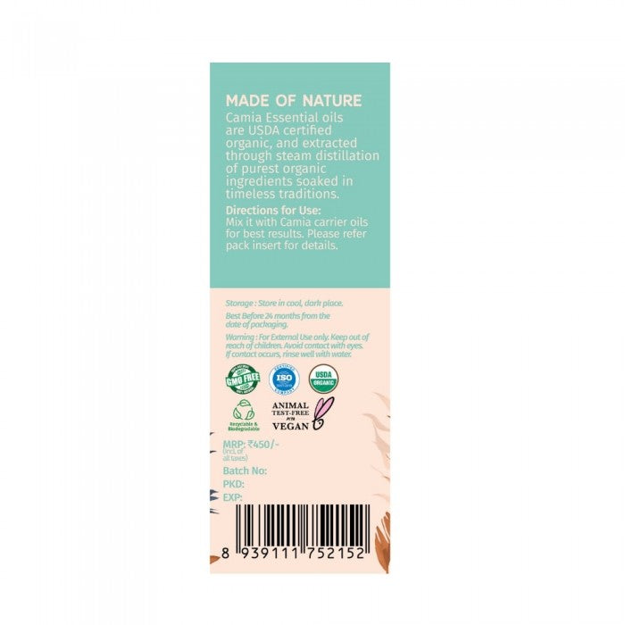 CAMIA essential oils are USDA certified organic and extracted through steam distillation of purest organic ingredients. All Camia essential oils are therapeutic grade, GMO free, paraben-free, sulphate-free, and come in plastic-free packaging