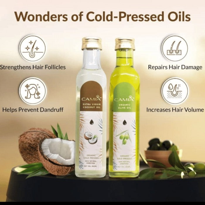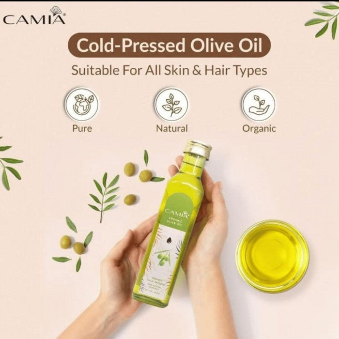 All Camia oils are certified organic, 100% natural, unrefined, cold-pressed, Non-GMO, paraben-free, sulfate-free, and come in plastic-free packaging.One of the healthier oils available today, cold-pressed virgin olive oil is great for your skin and hair.