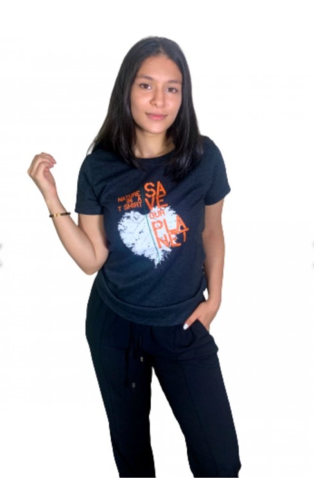 Non-Toxic Recycled Tee For Women. The Model Is Wearing A Size S. A Blend Of Pet Bottles And Pre Consumer Textiles. No Harmful Dyes Were Used In Making This Product. It Saves Water And Co2. It Is Made From 60% Recycled Cotton, 40% Recycled Pet.