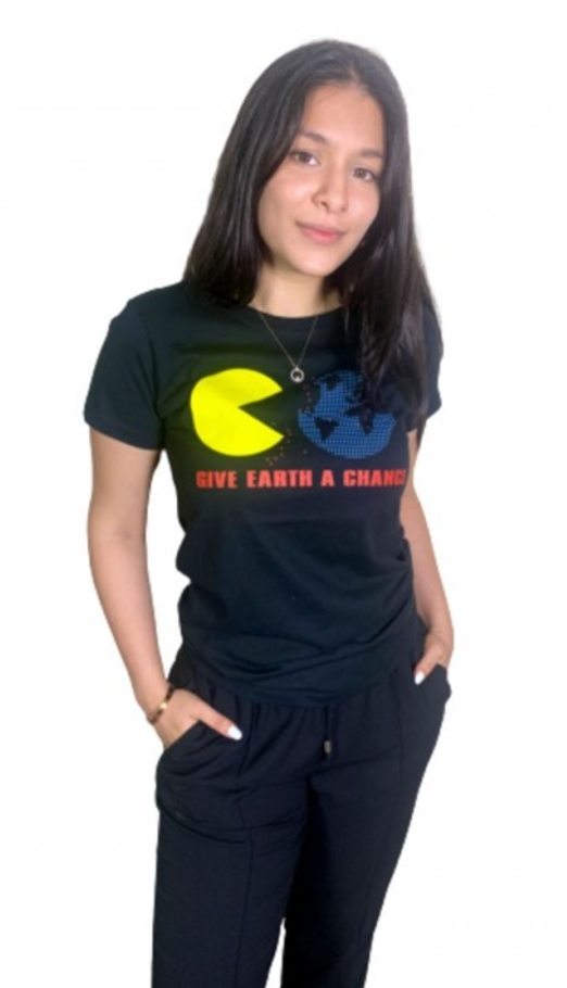 Pac-Man Recycled Tee For Women. The Model Is Wearing A Size S. A Blend Of Pet Bottles And Pre Consumer Textiles. No Harmful Dyes Were Used In Making This Product. It Saves Water And Co2. It Is Made From 60% Recycled Cotton, 40% Recycled Pet.