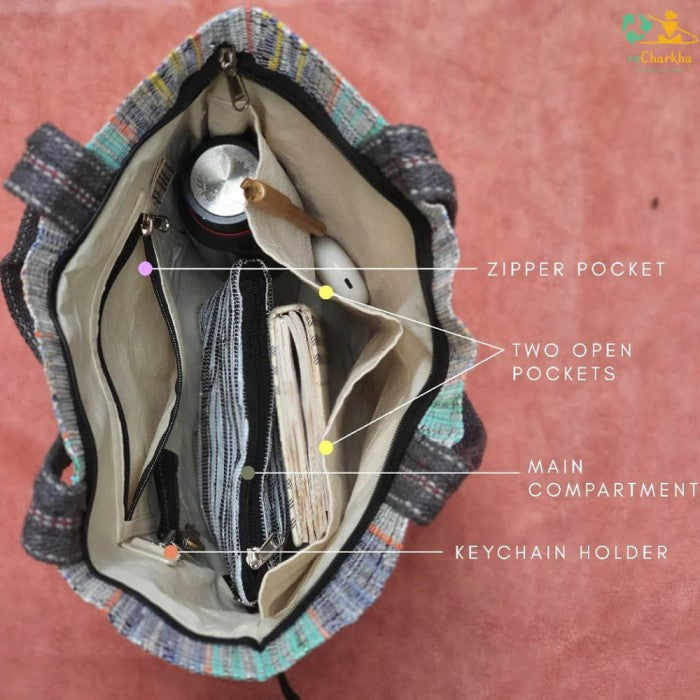 ReCharkha's UPCYCLED HANDWOVEN Shop-N-Go Tote is a Veteran and is a guaranteed eye-catcher, wherever you go! A perfect fit for everyone, right from college students, to office-goers, to shoppers, from everyday professionals to those who love a casual look!;