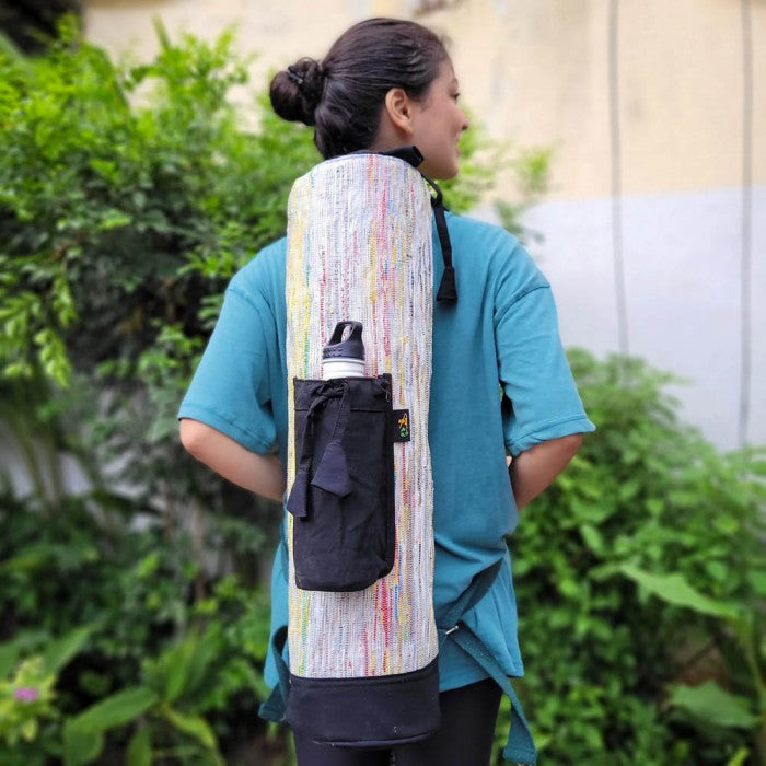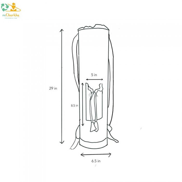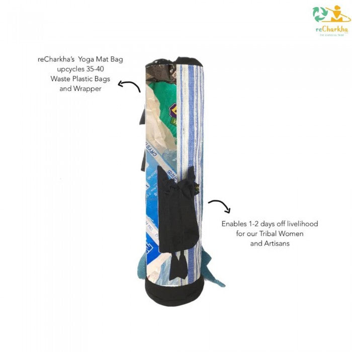 Carry your yoga mat, a bottle of water, your mobile phone, keys and wallet, ALL-IN-ONE in reCharkha's UPCYCLED-HANDWOVEN Yoga Bag! Hang it on your shoulder, sling-it around your body or wear both the straps on your back. With your Go Yoga Bag, you will take care of your body, mind as well as your planet, by UPCYCLING over 35-40 plastic bags and that too in style!